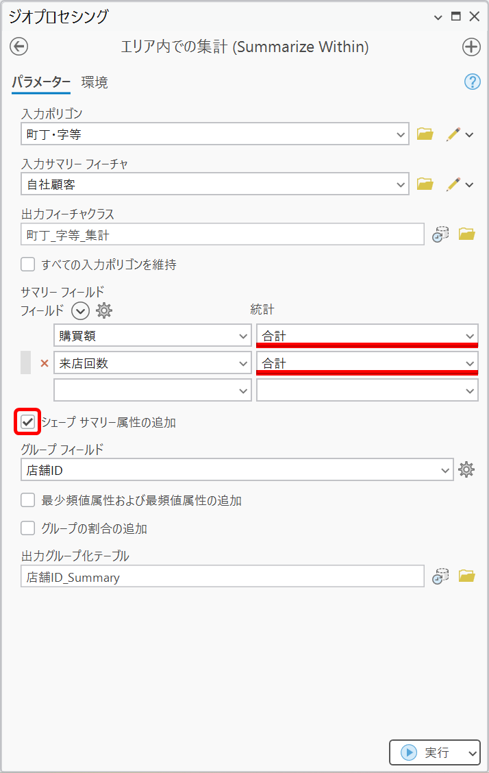 - [ターゲット フィーチャ]:集計する範囲のポリゴン
