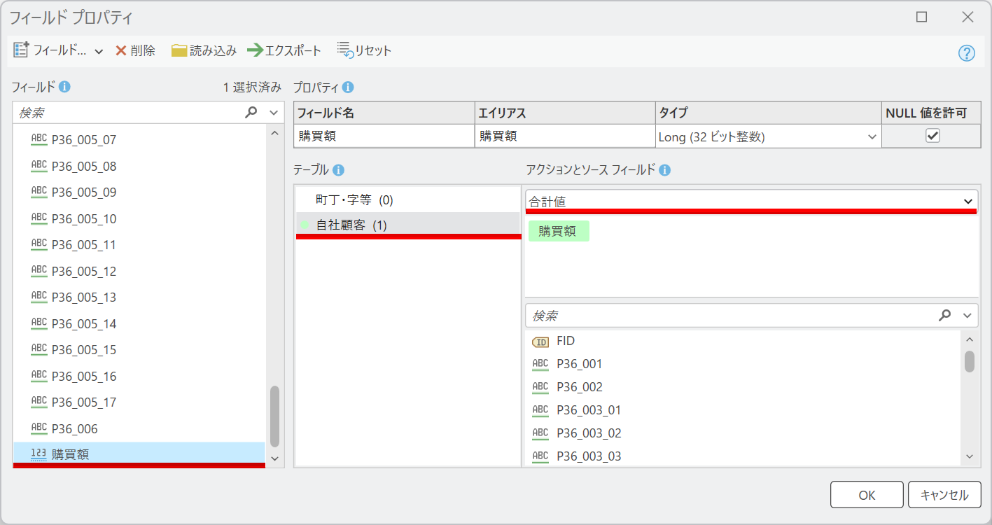 - 以下のようにパラメーターを設定します。以下の例では、顧客ポイントの属性である購買額を 町丁・字等レイヤーの境界ごとに集計します。