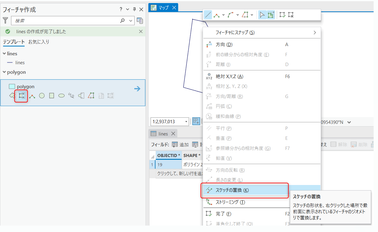 - マップ上でライン フィーチャにマウスを持っていき、右クリック → [スケッチの置換] をクリックします。