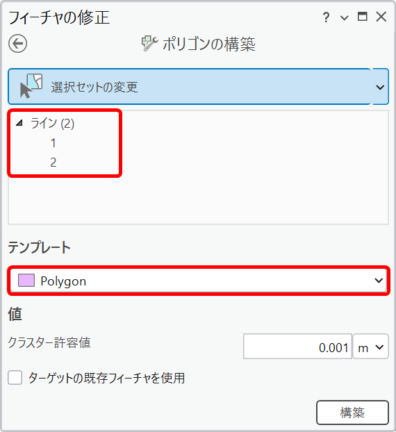 - [フィーチャの修正] ウィンドウ → [構築] → [ポリゴンの構築] をクリックします。