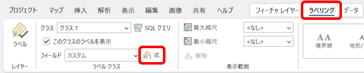 2. [ラベル クラス] グループにある [フィールド] の [式] ボタンをクリックします。