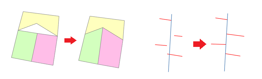 [フィーチャの修正] ウィンドウの [フィーチャに一致] ツールを使用することで、複数のフィーチャが関係するポリゴンの隙間の穴埋めや、複数のライン フィーチャの延長・切り詰めができます。