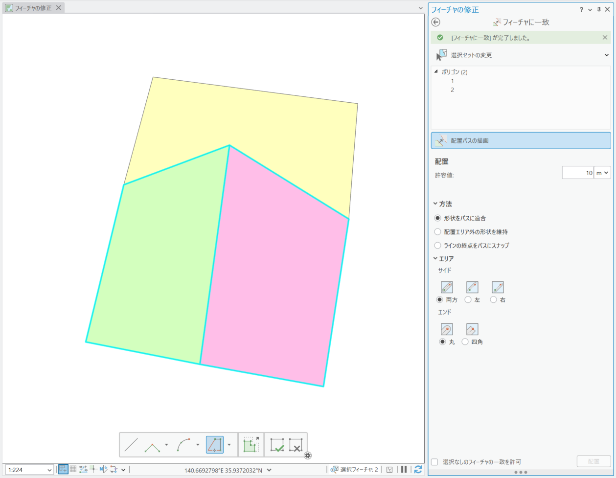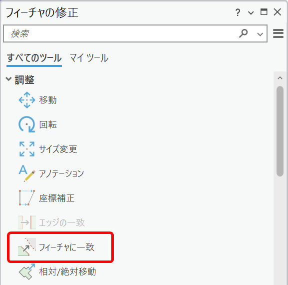 - [フィーチャの修正] ウィンドウにある [調整] → [フィーチャに一致] ツールをクリックします。