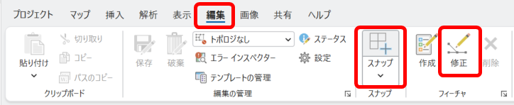 - [編集] タブ → [修正] をクリックします。また、スナップが有効化されていない場合は [スナップ] をクリックして有効にします。