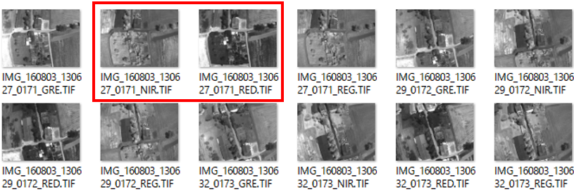 NDVI 画像を作成するには、赤スペクトル情報と近赤外スペクトル情報が必要です。マルチスペクトル センサーで撮影した画像セットには複数のスペクトル情報が格納されます。その中に、赤 (RED) バンド画像と近赤外 (NIR) バンド画像が格納されていることを確認します。
