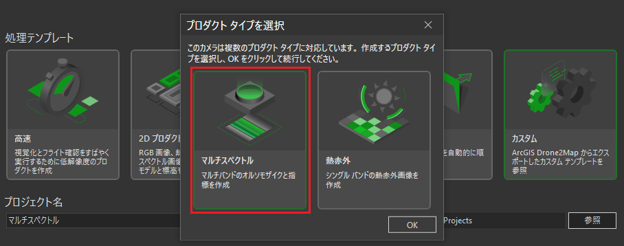 - [プロダクト タイプを選択] ダイアログが表示されます。このダイアログで [マルチスペクトル] を選択します。