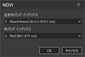 - [NDVI] ダイアログで必要なバンドをドロップダウン リストから選択して [OK] をクリックします。