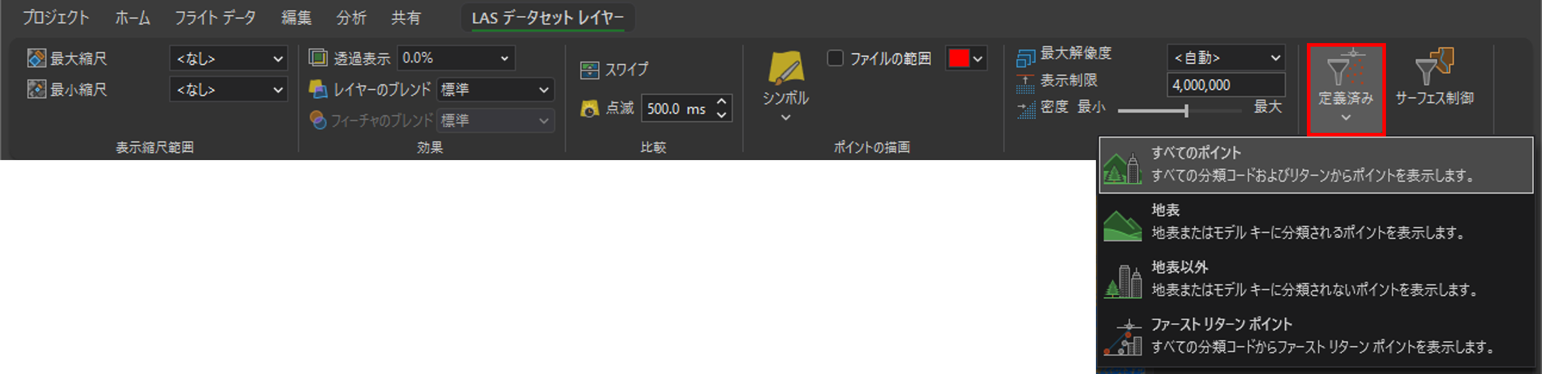 DSM ポイント クラウドがどのように地表分類されたのかは、[LAS データセット レイヤー] タブの [ポイント フィルター] グループにある [定義済み] ボタンから確認できます。