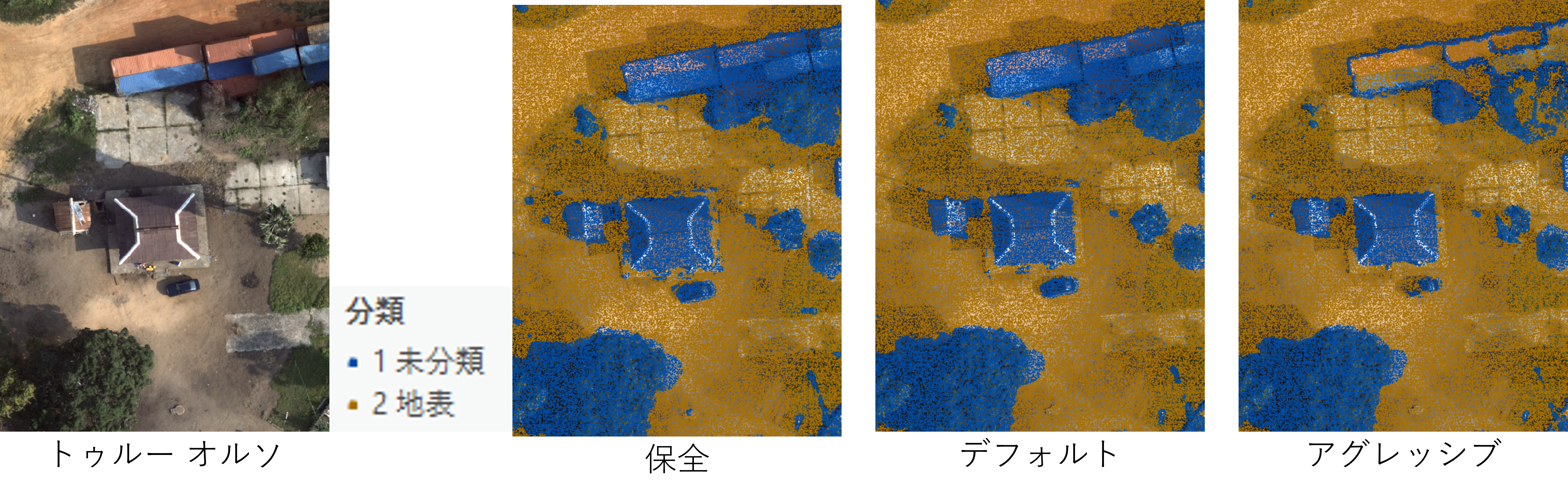 [アグレッシブ] に設定すると建物の近くのコンテナや車の一部も地表として分類されています。このような建物を含む画像の場合は、[デフォルト] や [保全] が適切に処理できています。