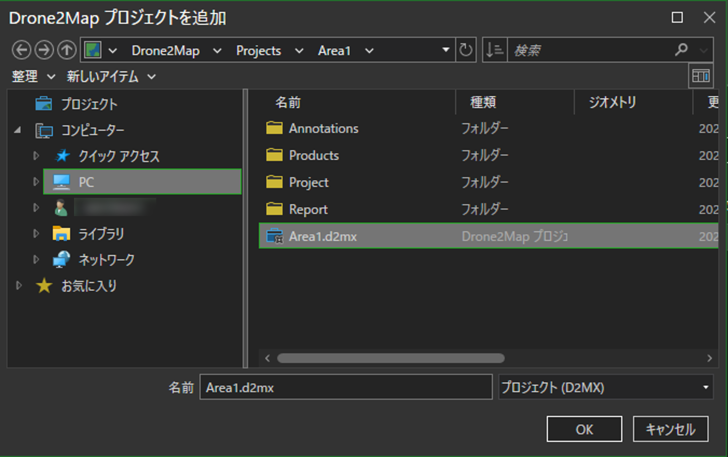 - [Drone2Map プロジェクトを追加] ダイアログでバッチ処理を行いたいプロジェクトを選択し [OK] をクリックします。