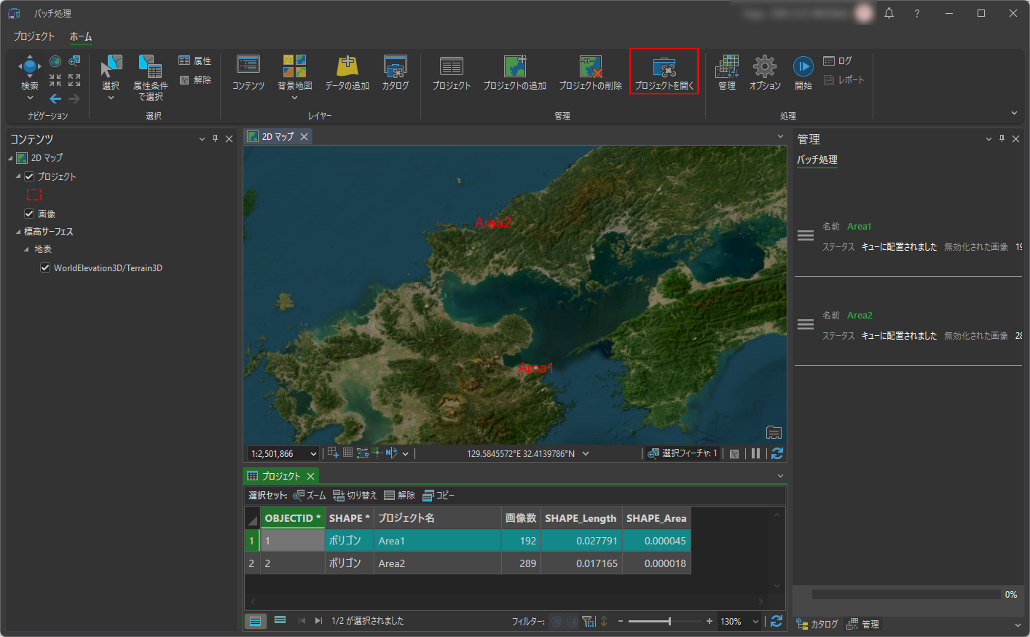処理が完了したら各プロジェクトを開き成果物を確認することができます。[プロジェクト] テーブルからプロジェクトを選択し、[プロジェクトを開く] をクリックします。選択したプロジェクトが別ウィンドウで開きます。