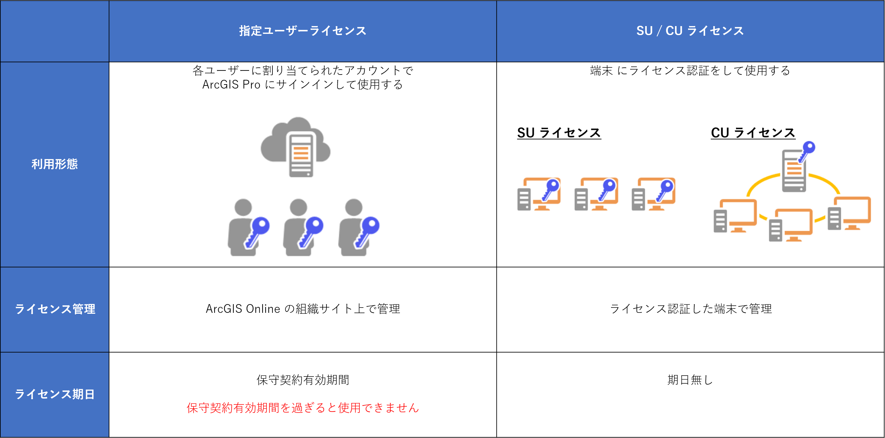 ArcGIS Pro のライセンス形態には「指定ユーザーライセンス」と「SU/CU ライセンス」があります。デフォルトは「指定ユーザー ライセンス」となっていますが、ArcGIS Desktop 単独使用(SU)ライセンスまたは同時使用(CU)ライセンスをご契約の方は、必要に応じて「SU/CU ライセンス」に移行することも可能です。それぞれのライセンス形態の特徴は以下の通りです。
