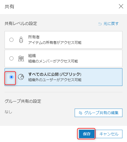- [共有レベルの設定] で [すべての人に公開(パブリック)] を選択し、[保存] をクリックします。