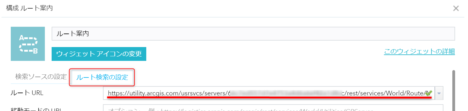 - [ルート検索の設定] タブ → [ルート URL] に、ステップ 6 でコピーした URL を貼り付けます。チェック マークがついたら、OK をクリックします。