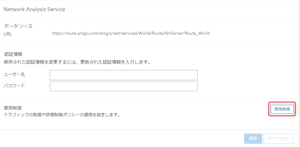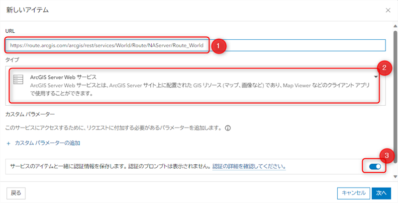 - [URL] : [ルート案内] ウィジェットで利用する、World route service のURLを入力します。 https://route.arcgis.com/arcgis/rest/services/World/Route/NAServer/Route_World
