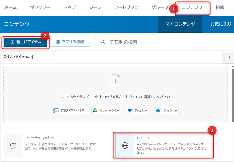 - [コンテンツ] ページ → [新しいアイテム] → [URL] をクリックします。