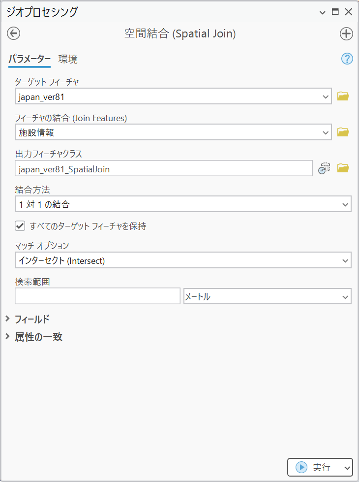 - 結合フィーチャのフィールドマップ: 出力フィーチャクラスに対してフィールドを追加・削除する際に使用します。