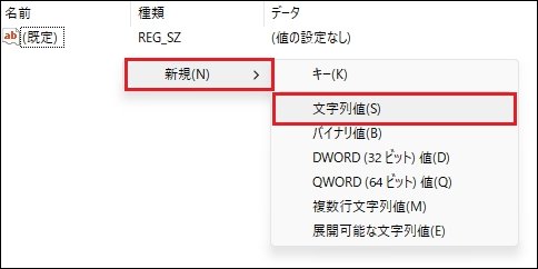 - [CodePage] フォルダーをクリックして開き、(既定) 下あたりの空欄を右クリック→ [新規] → [文字列値] をクリックします。