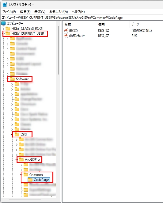 以下の手順は、文字コード設定ユーティリティの [対象アプリケーション:] から ArcGIS Pro を選択できない場合に、レジストリ エディターから文字コードの設定を行う方法です。