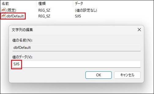 - [dbfDefault] と名前をつけ、フォルダをダブルクリックし、[値のデータ(V):] 欄には任意の値を入力します。