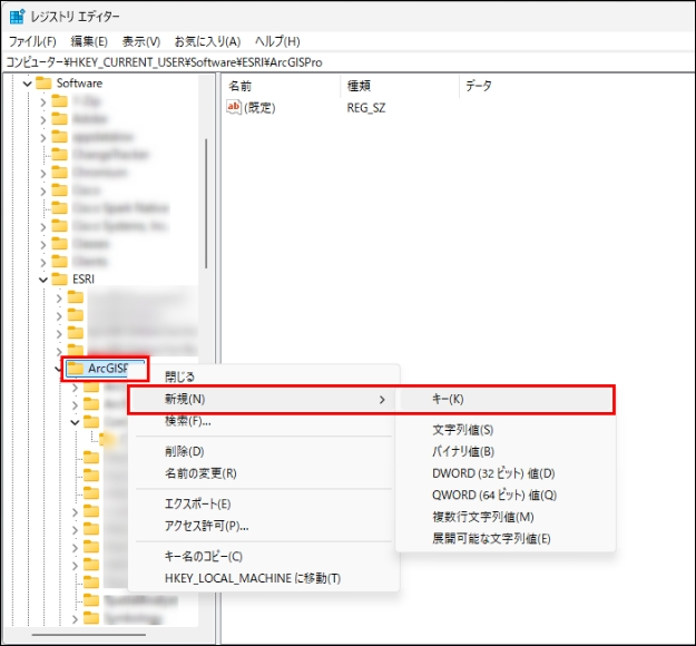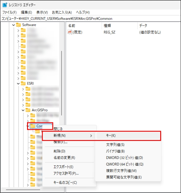 以下の手順で \Common\CodePage フォルダーを作成し、文字コードの設定を行います。- ArcGIS Pro のフォルダーを右クリック→ [新規] → [キー] をクリックし、 [Common] と名前をつけて新規フォルダー作成します。