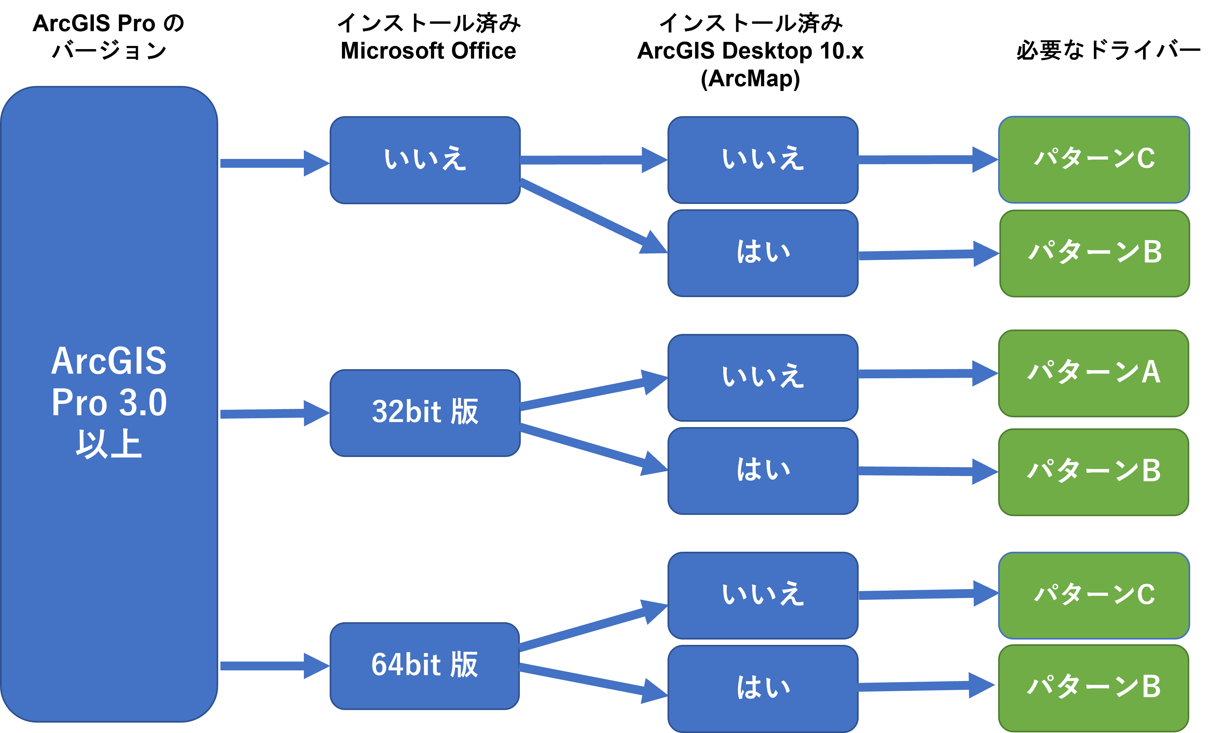 インストールされている Microsoft Office や ArcGIS Desktop などの環境によってインストールするドライバーが異なります。必要なドライバーをご確認の上、インストールを行ってください。