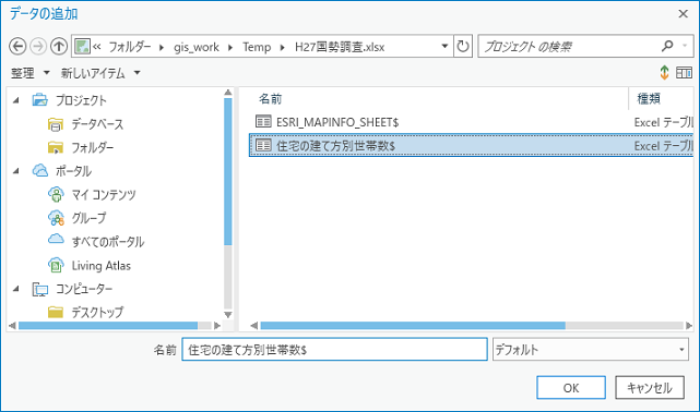または、[マップ] タブの [レイヤー] → [データの追加] から、Excelファイル(*.xls, *.xlsx)をダブルクリックします。 - シート名が表示されますので、読み込みたいシートを選択します。シート名の末尾には「$」が付与されます。