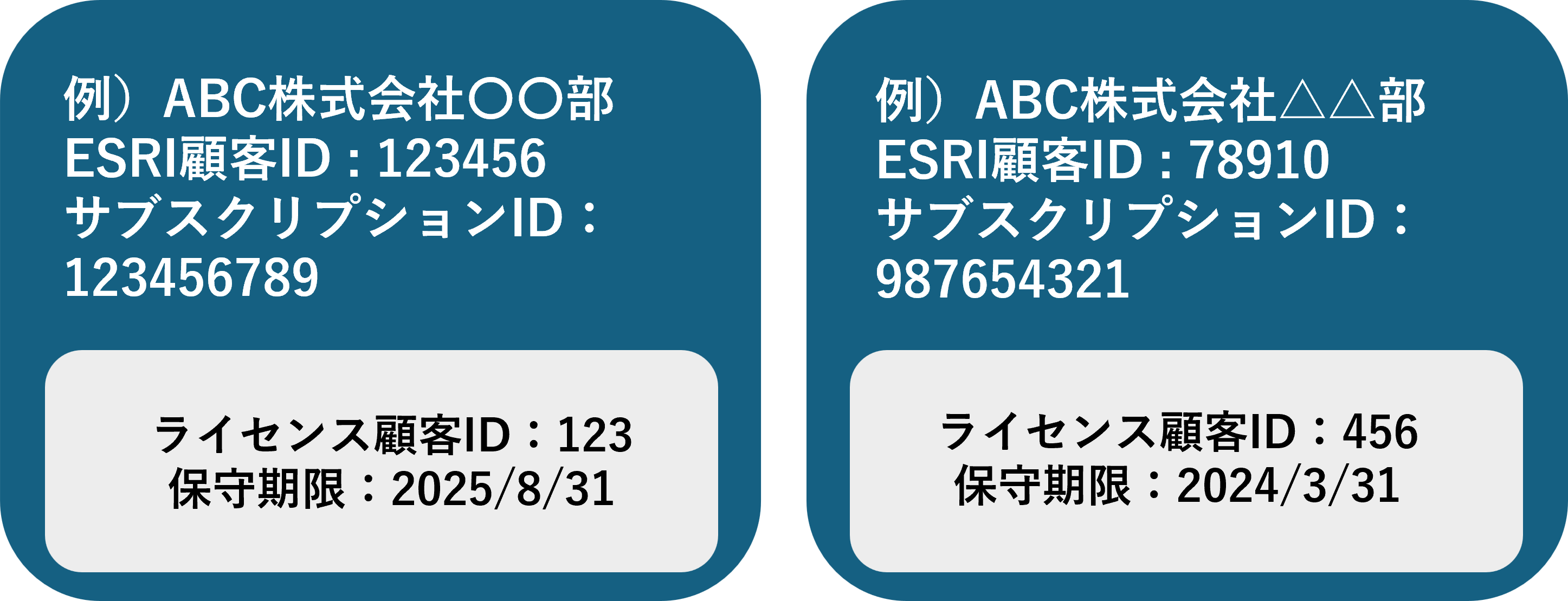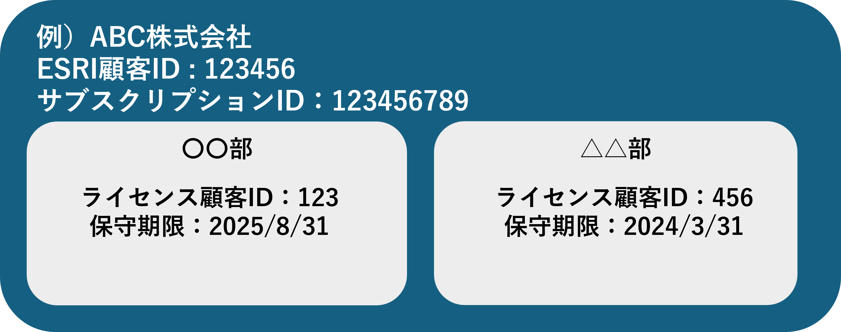 ESRI顧客ID の下に紐づく形で存在し、1 つの ESRI 顧客ID に複数のライセンス顧客ID が紐づく場合もございます。