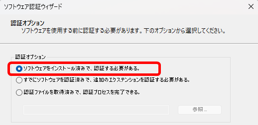 - [ソフトウェアをインストール済みで、認証する必要がある] を選択し、[次へ] をクリックします。
