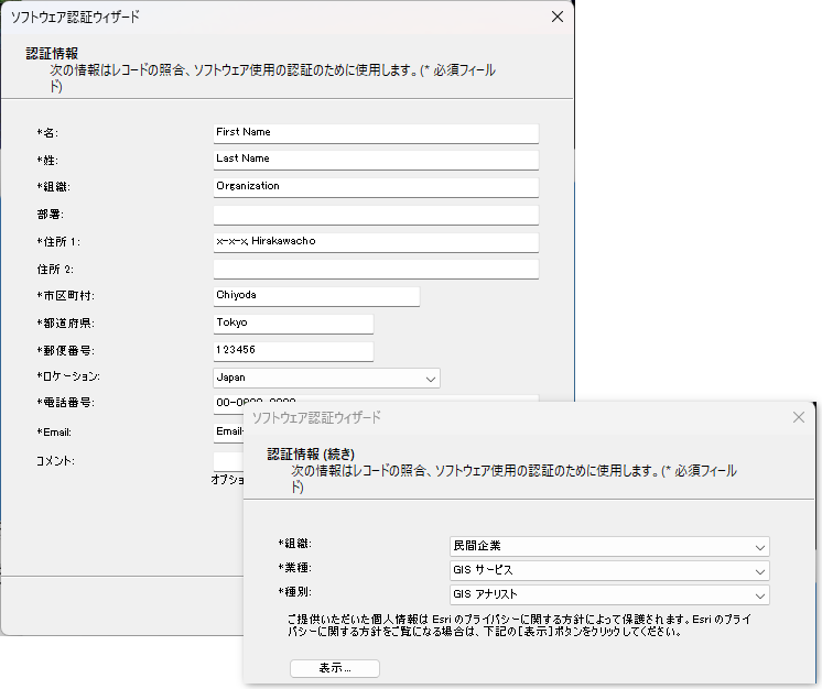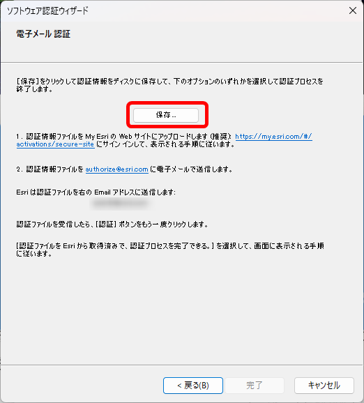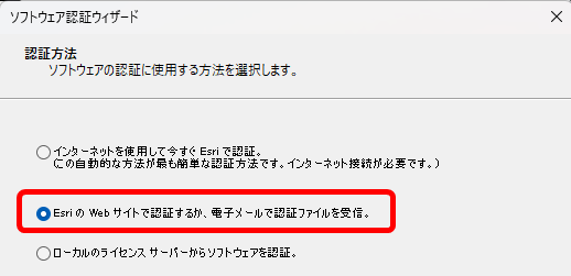 - [Esri の Web サイトで認証するか、電子メールで認証ファイルを受信。] を選択し、[次へ] をクリックします。