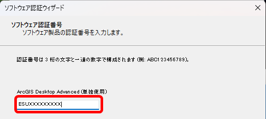 - ライセンス認証番号 (ESU から始まる 9 桁の番号) を入力します。
