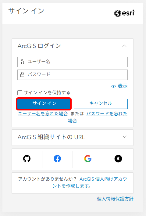 - インターネットに接続されたコンピューターで Web ブラウザを起動し、My Esri (https://my.esri.com/) を開き、Esri アカウントのユーザー名とパスワードを入力し、[サイン イン] をクリックします。