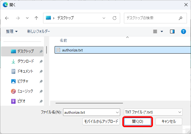 - [アップロードするファイルの選択] ダイアログで、保存したファイル (authorize.txt) を選択し、[開く] をクリックします。