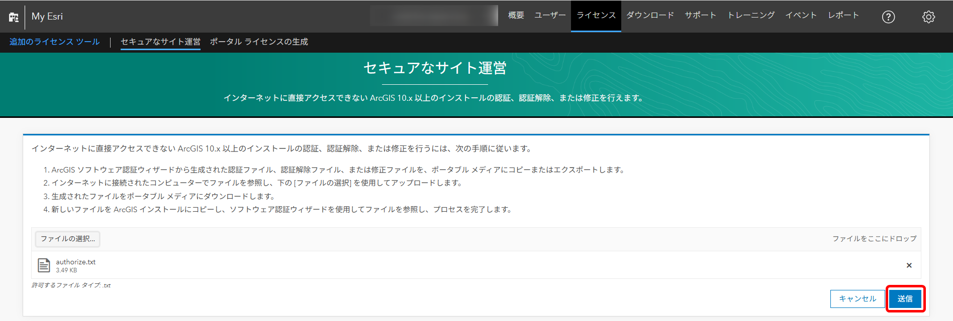 - My Esri 上の [セキュアなサイト運営] ページに戻り、[送信] をクリックします。