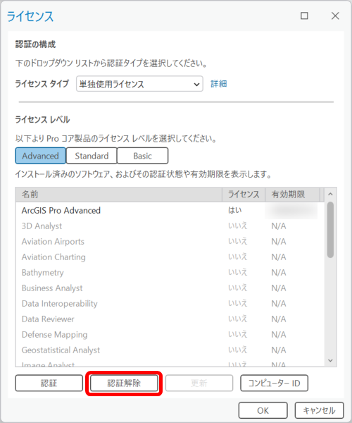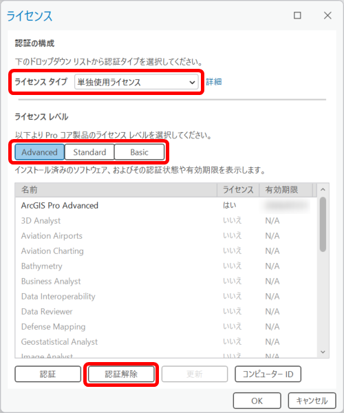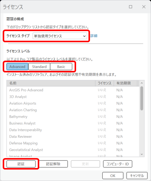 ArcGIS Pro: SU(単独使用)ライセンスのオフライン認証・認証解除