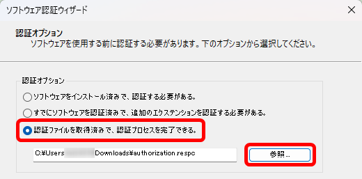- [認証オプション] 画面で [認証ファイルを Esri から取得済みで、認証プロセスを完了できる] を選択 → [参照] ボタンから保存した authorization.respc を指定 → [次へ] をクリックします。