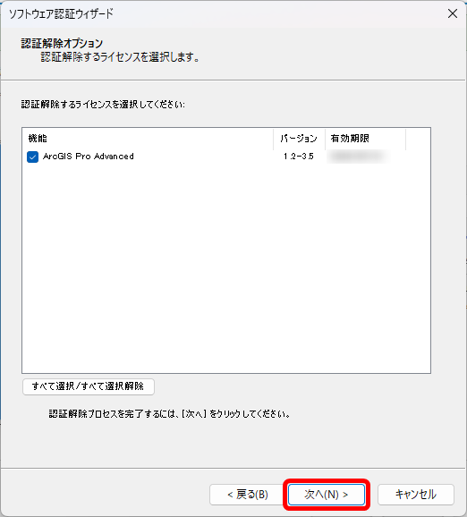 - [認証解除オプション] 画面で、認証解除するライセンスが選択されていることを確認し [次へ] をクリックします。