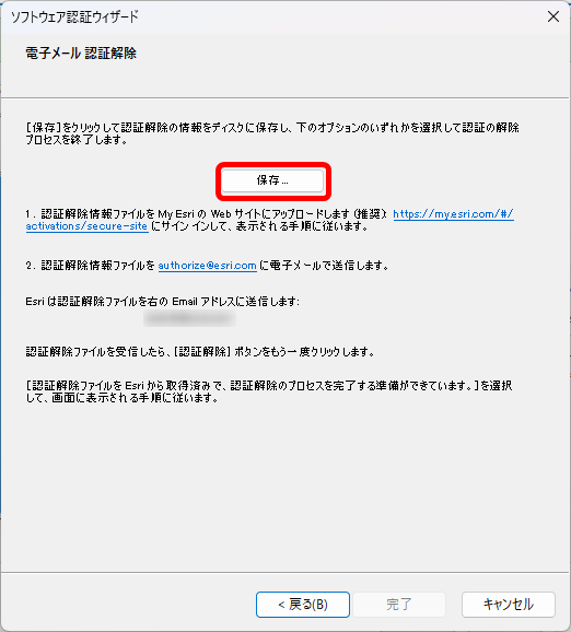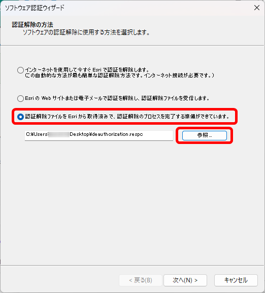 - [認証オプション] 画面で [認証ファイルを Esri から取得済みで、認証プロセスを完了できる] を選択 → [参照] ボタンから保存した deauthorization.respc を指定 → [次へ] をクリックします。[完了] ボタンでダイアログを閉じます。