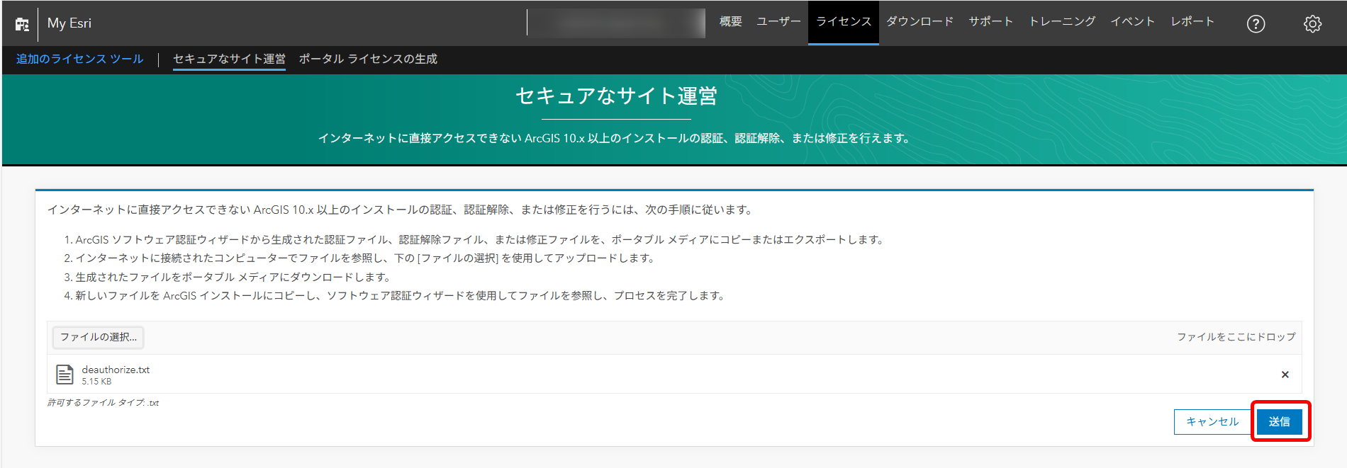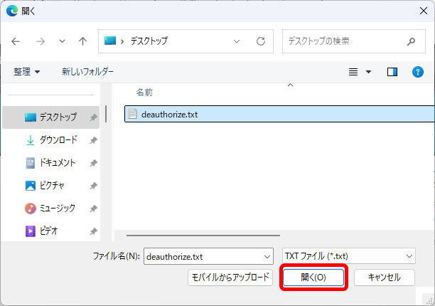 - [アップロードするファイルの選択] ダイアログで、保存した認証解除情報ファイル (deauthorize.txt) を選択し、[開く] をクリックします。