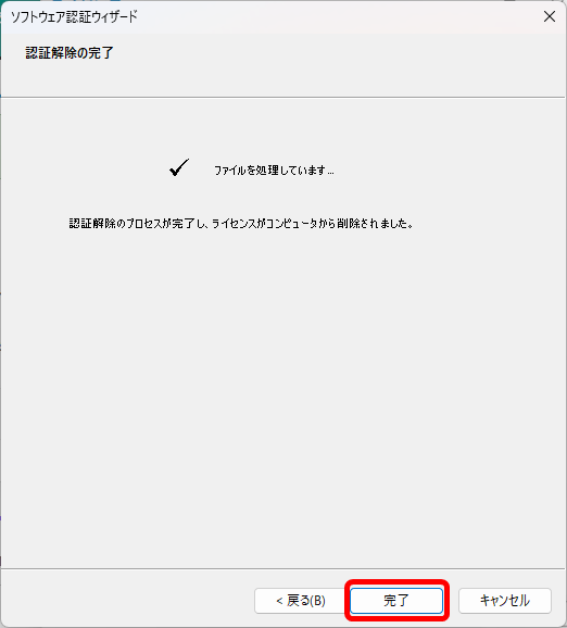 ※ C ドライブ直下など、ファイルのパス名に全角文字および半角の空白文字が含まれないようにしてください。 - [完了] ボタンでダイアログを閉じ、作成された deauthorize.txt をインターネット環境接続可能なコンピューターにコピーします。