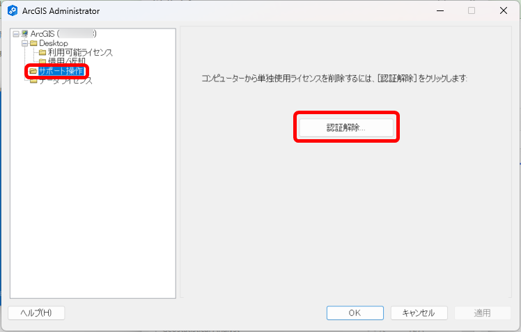ArcGIS Administrator から認証解除する場合は、ArcGIS Administrator を起動 → [サポート操作] → [認証解除] から認証解除を行います。