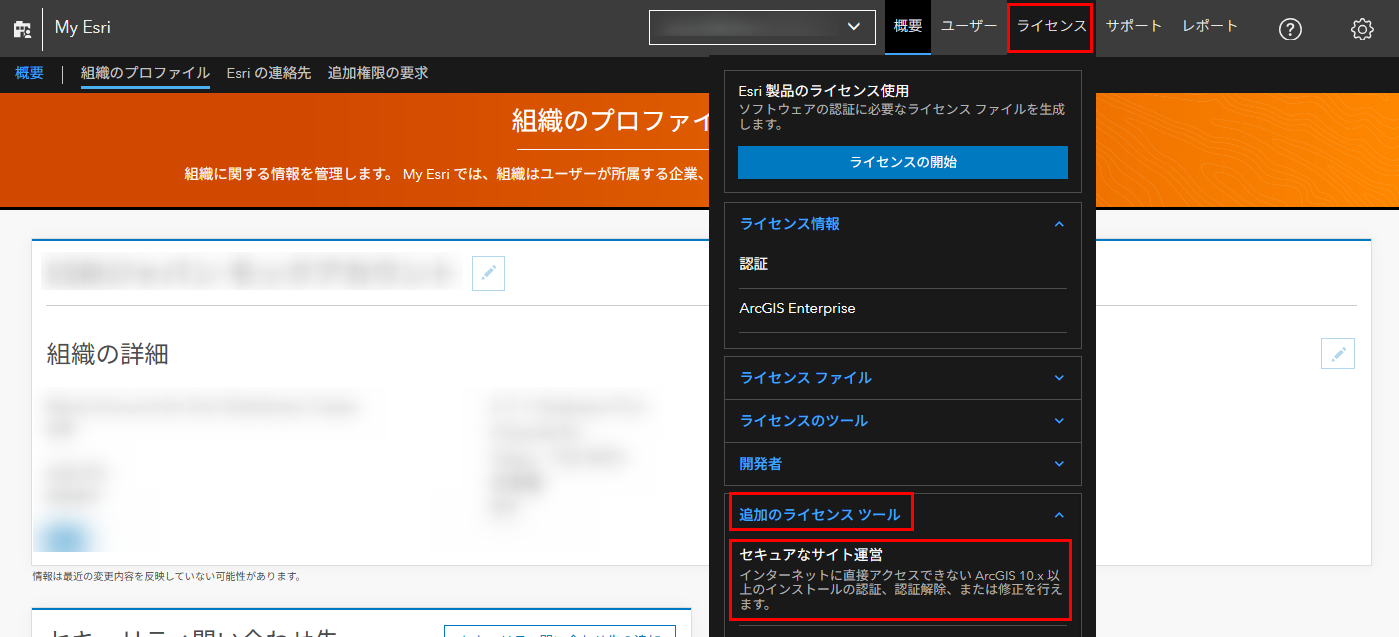 - My Esri で [ライセンス] タブ → [追加のライセンス ツール] → [セキュアなサイト運営] をクリックします。