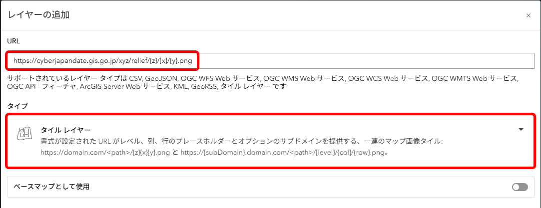 - 地理院地図タイルの URL を入力し、[タイプ] を [タイル レイヤー] に変更し、[次へ] をクリックします。