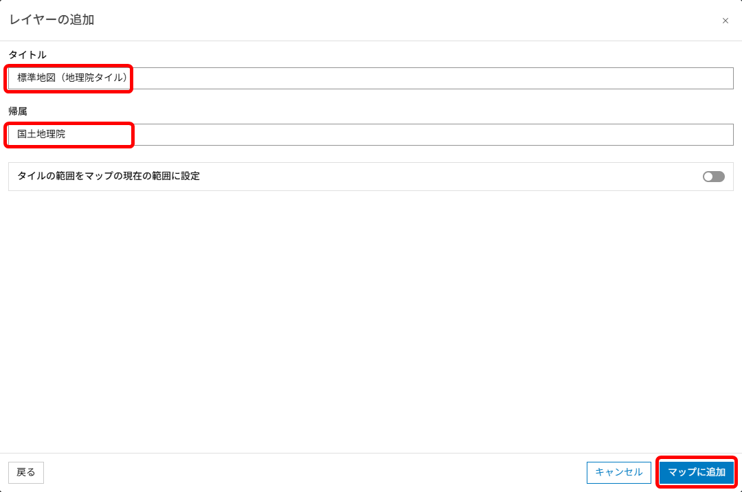 [タイトル]、[帰属] に適切な文字を入力し、[マップに追加] をクリックします。