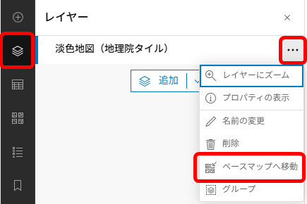 地理院タイルをベースマップに設定するには、コンテンツを追加する際に [ベースマップとして使用] オプションを選択するか、レイヤー横の [...] をクリックし [ベースマップへ移動] をクリックします。