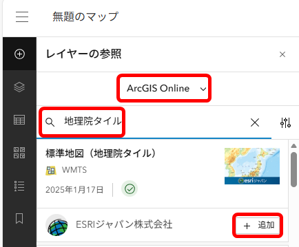 - 検索対象を [ArcGIS Online] に変更して [地理院タイル] と入力し検索します。