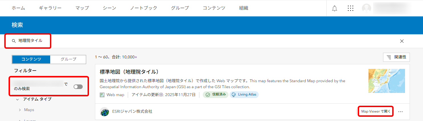 利用したい地理院タイルが決まっている場合は、「標準地図」のようにタイルの名前で検索します。 - 左パネルの [<組織名>でのみ検索] オプションを無効化します。