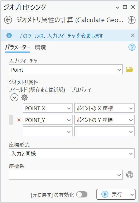 - [ジオプロセシング] ウィンドウ → [ツールボックス] → [データ管理ツール] → [フィーチャ] → [ジオメトリ属性の計算]