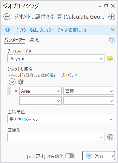 入力フィーチャの座標系が地理座標系の場合は、 [面積(測地線)] [周囲長 (測地線)] を選択してください。