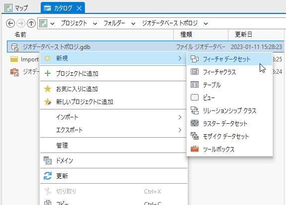 - [カタログ] ウィンドウまたは [カタログ] ビューで任意のフォルダー内にファイル ジオデータベースを準備します。ファイル ジオデータベースを右クリックし、[新規] から [フィーチャ データセット] を選択します。